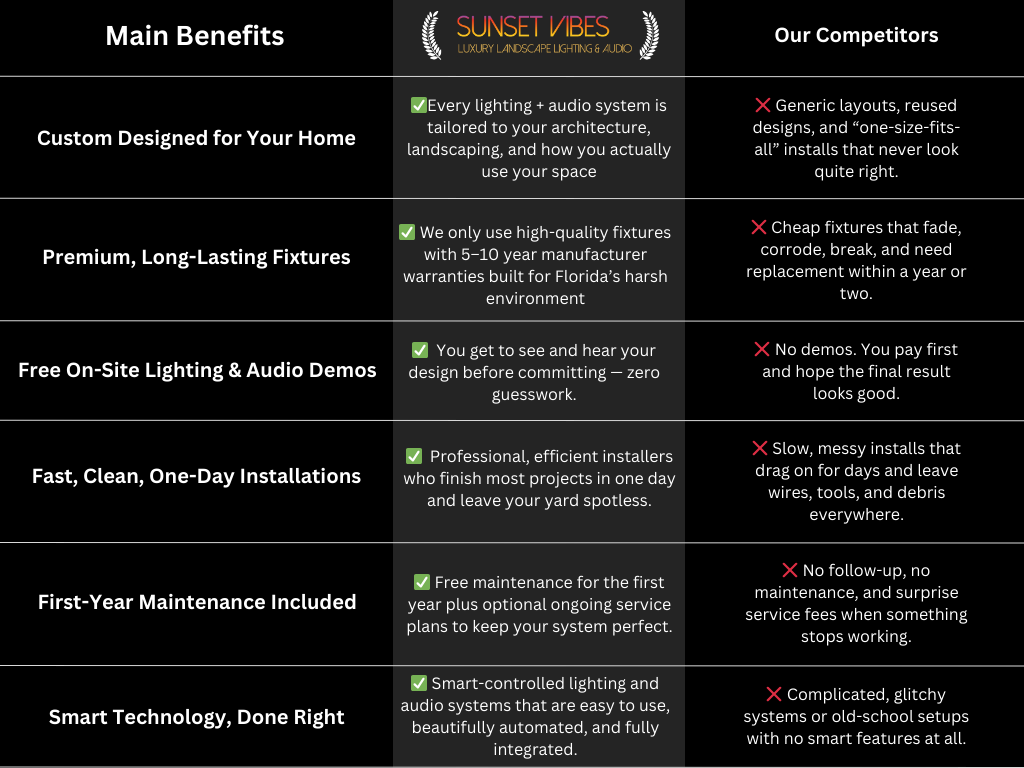 Yes. Sunset Vibes provides free on-site lighting and outdoor audio demos so you can experience the transformation before committing. Most clients are blown away when they see and hear the difference in person.